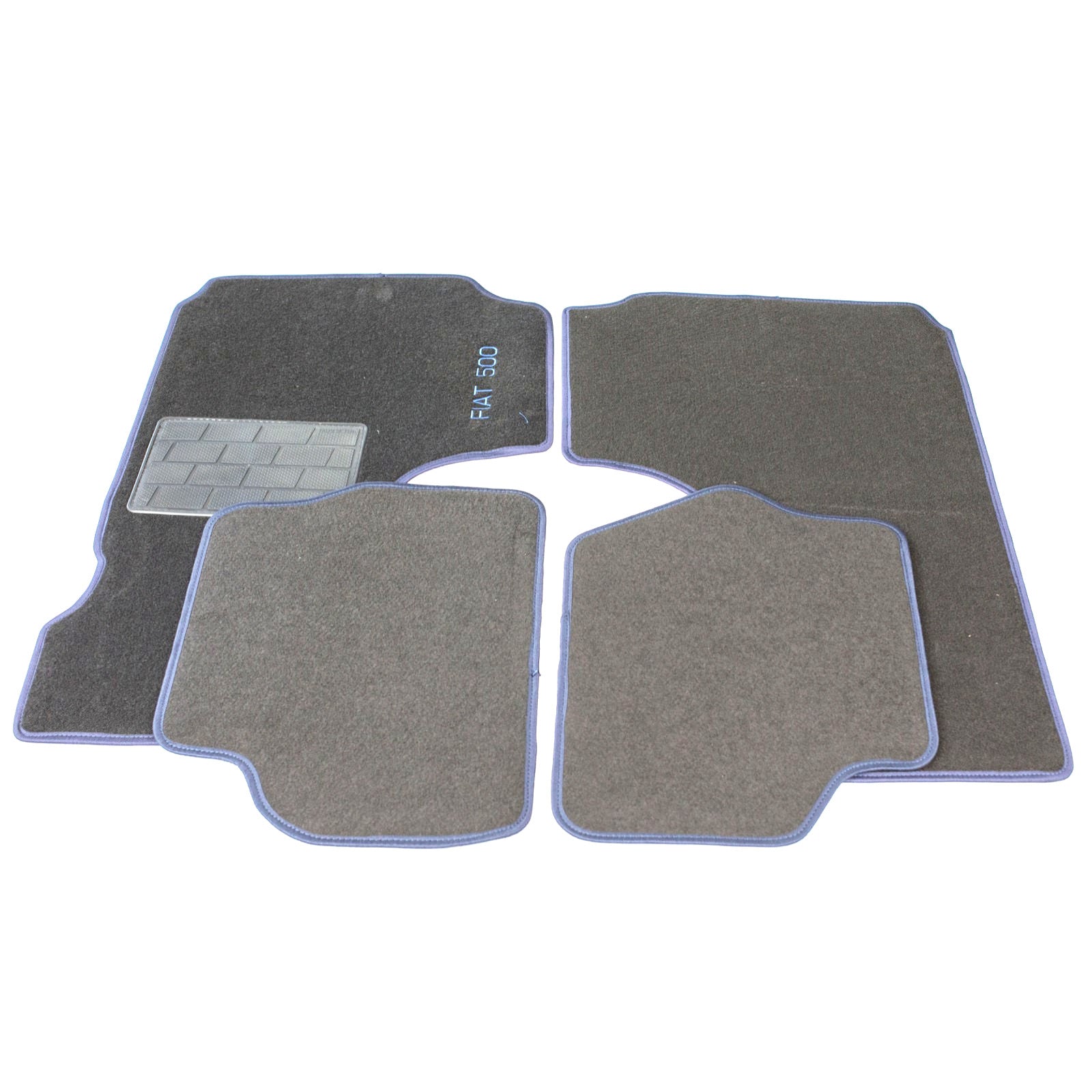 Serie sovra tappeti neri in moquette con bordo blu Fiat 500 D F L R con logo